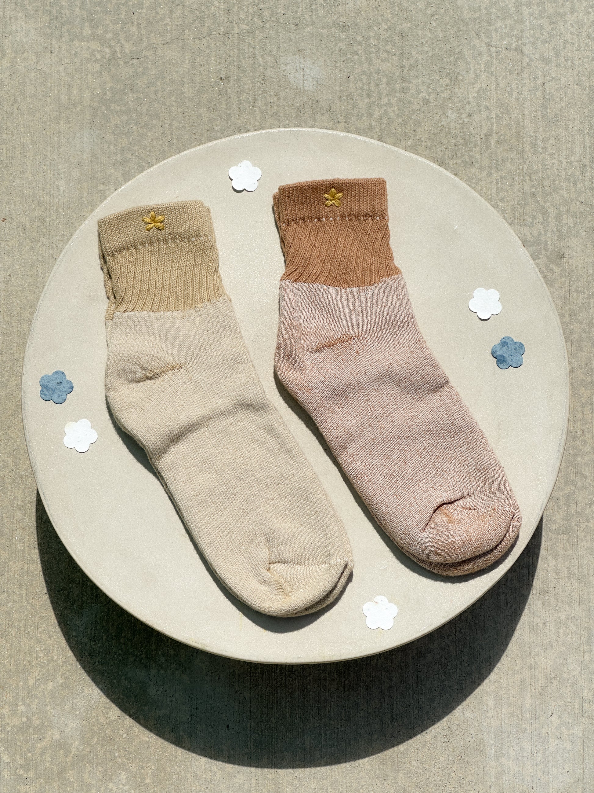 These socks are made from organic cotton carefully bred by Sally Fox in the Capay Valley of California, organically grown by Alvarez Farms and Dr. Delgado on the fields of New Mexico, and spun and knit by Organic Threads in North Carolina. Features a sweet coi detail, a hand-embroidered flower on one side of each sock in every pair.