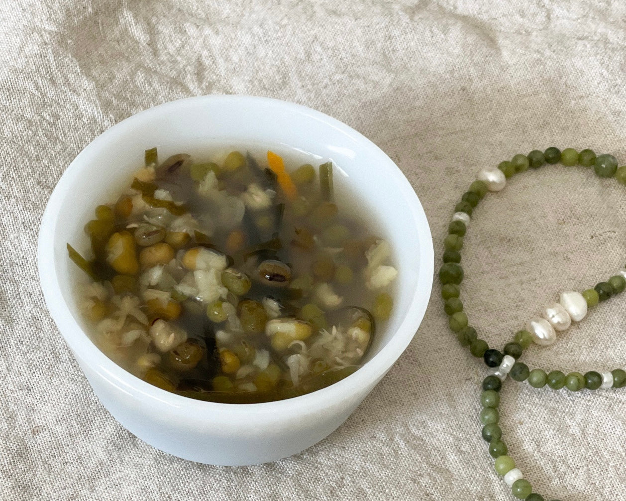 on a warm day, we fill our bowls with mung bean soup. dried tangerine peels hugging mung beans soaked overnight. my reflection bounces in the water. a sweet smile.
