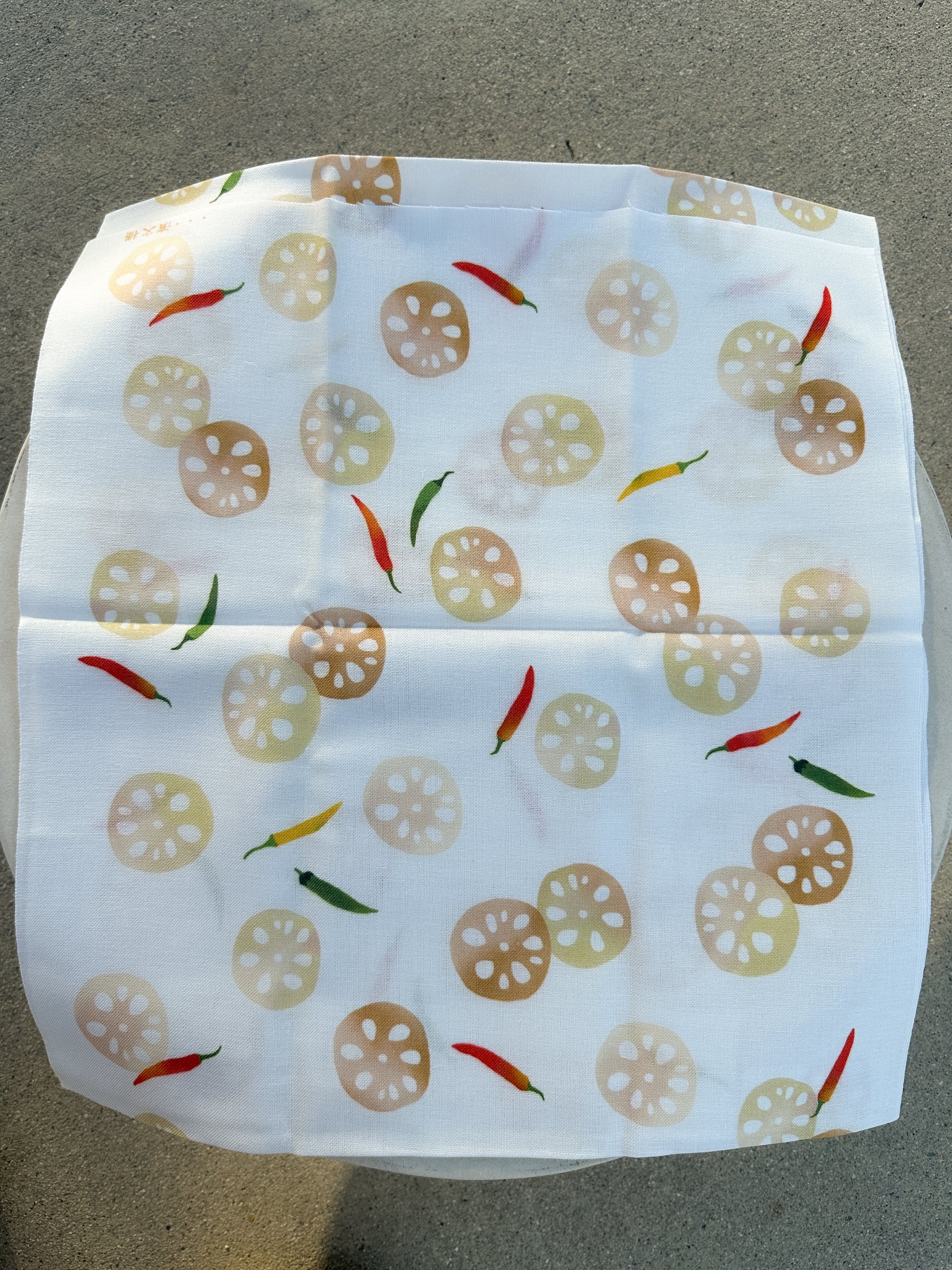 This particular tenegui is an off-white color and features a repeated pattern of red and green chili peppers and light brown gradient-colored sliced lotus roots. Actual colors may vary from the screen.