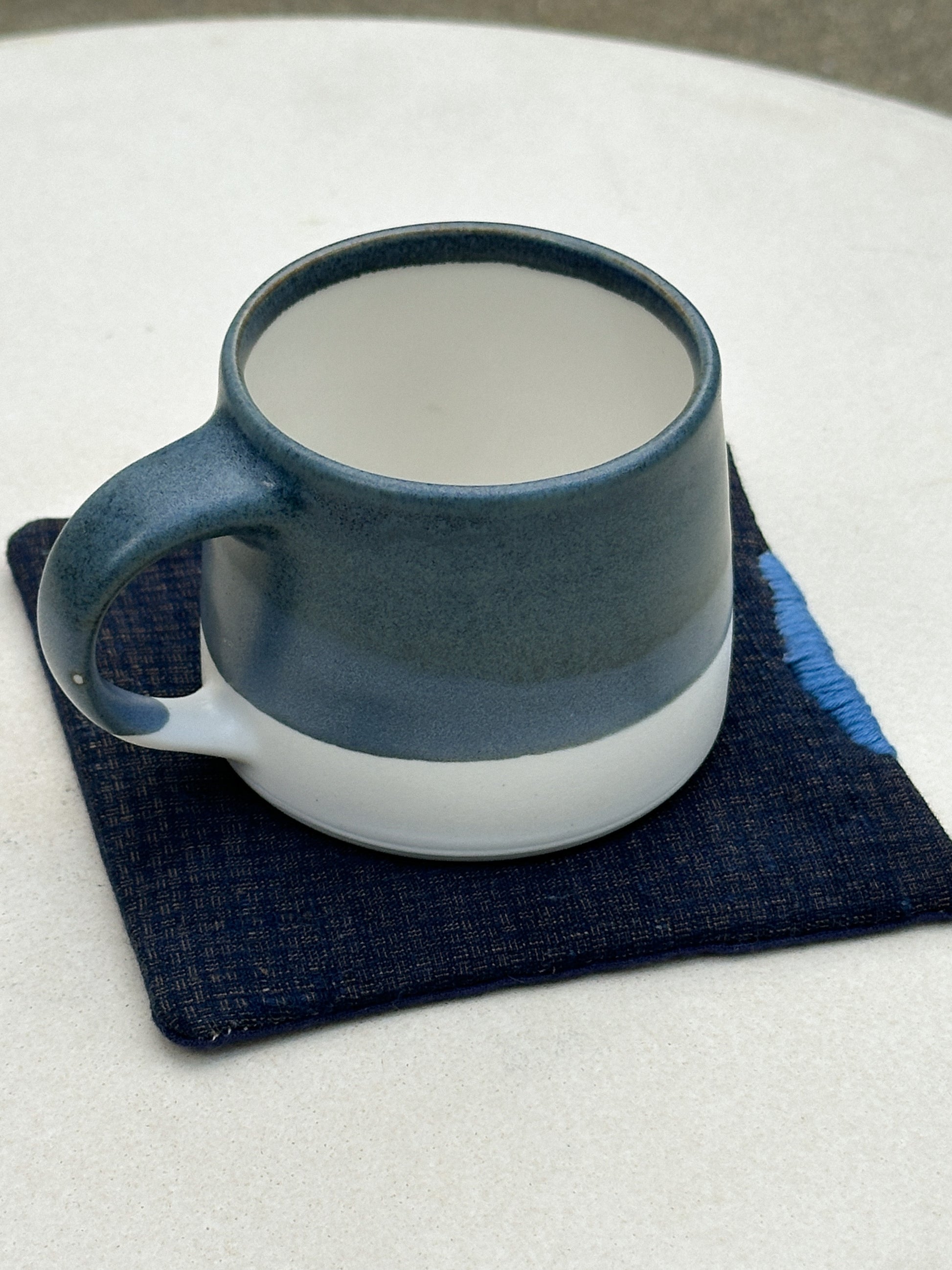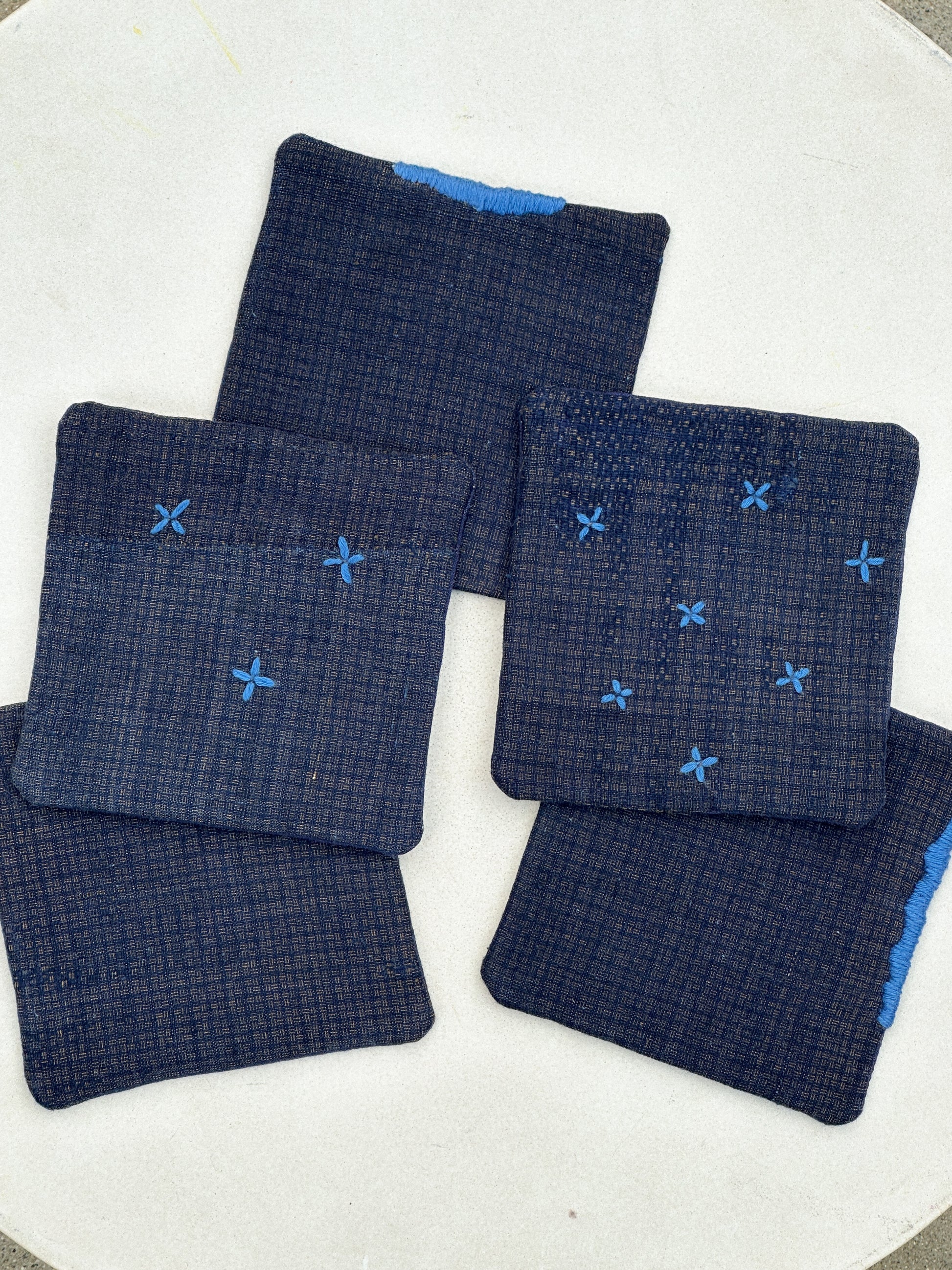 Made from vintage fabric scraps we found at flea markets in Tokyo and lined inside with cotton batting, these coasters provide a soft landing for cups, bottles, and little trinkets. The front side is a dark navy plaid weave, while the back side is a navy blue color. Imperfectly hand-embroidered with blue cotton thread.